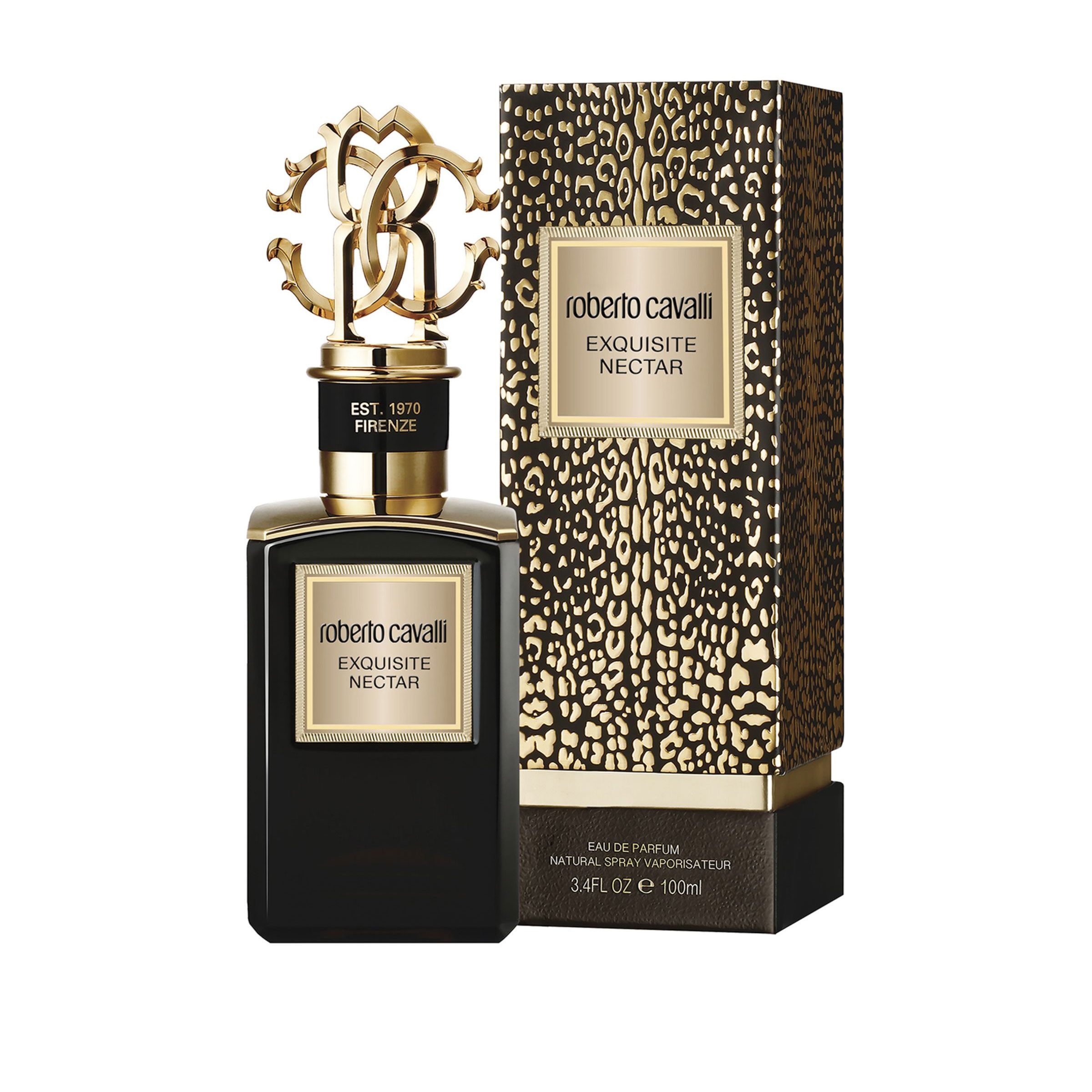 Roberto Cavalli Exquisite Nectar is the Middle Eastern edition of the Gold selection fragrance that evokes a sense of warmth through notes of sandalwood, rose and iris. The glass bottles of dark chocolate color with a gold name plate are decorated with heavy metal stoppers with the logo of the house. Top notes are Neroli, Bergamot, Cardamon, Jasmine absolute. Middle notes are Sidr honey accord, Orange flower oil. Base notes are Cedarwood oil, Patchouli oil, Ambrostar